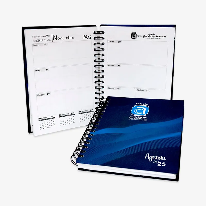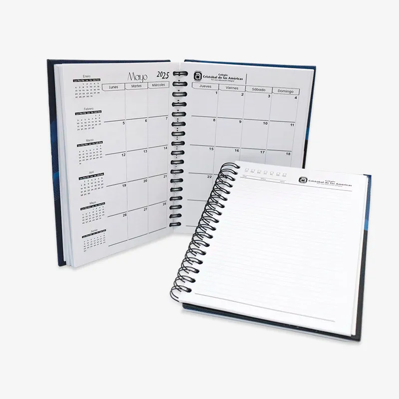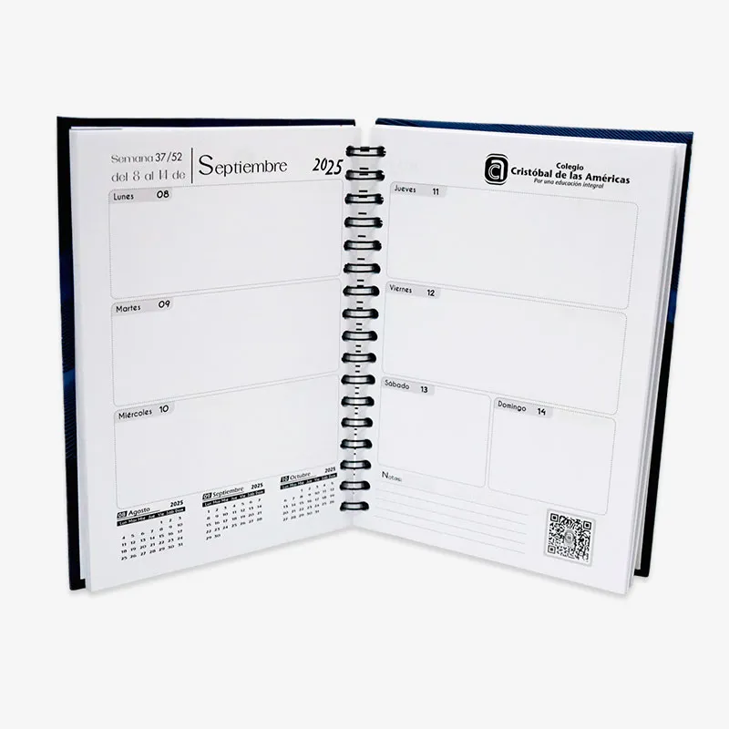 Agenda semanal con planeador mensual, 34 hojas para notas impresas a un tinta en color negro un separador impreso a color frente y vuelta en papel couché de 250gr. (Grueso)