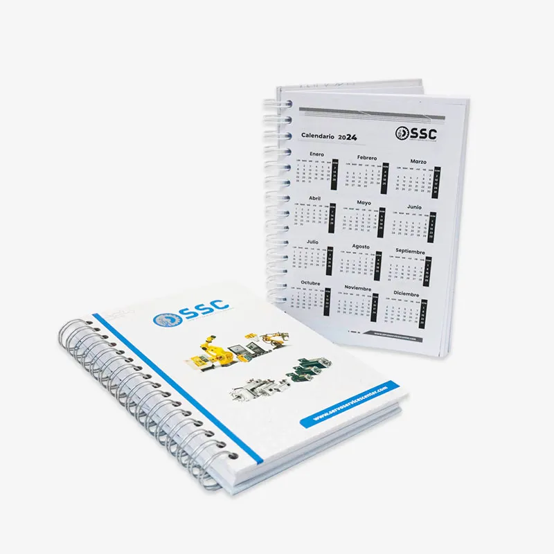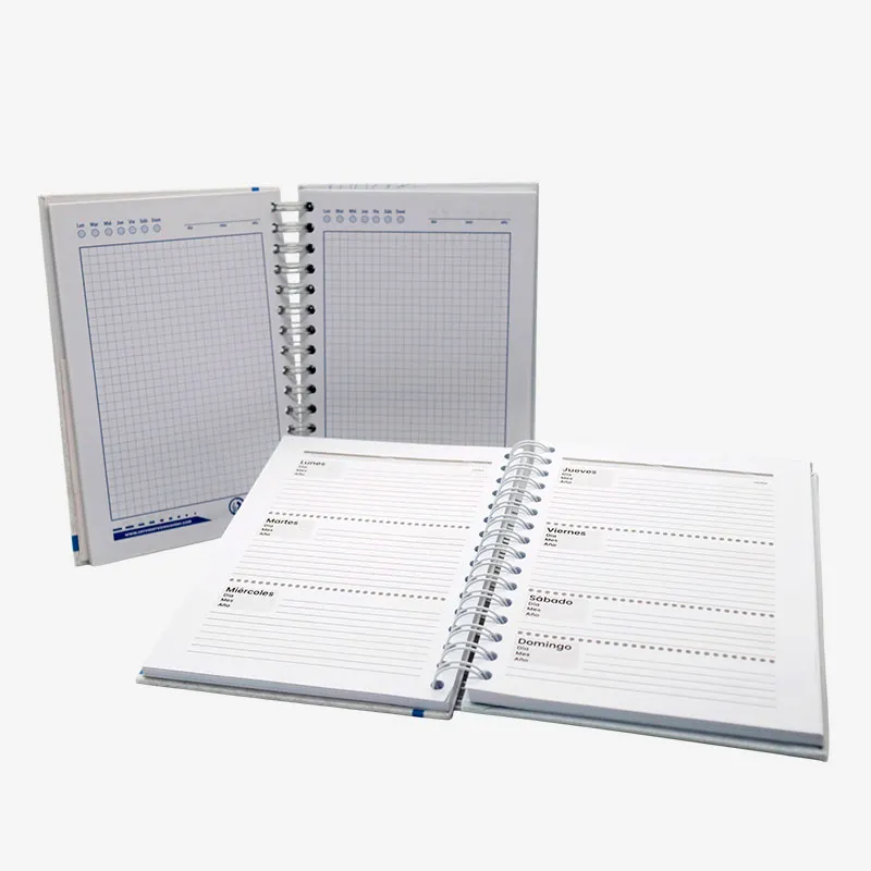 Una hoja inicial con calendario anual, impreso a una 1 tinta, 45 hojas para semanario atemporal y 55 hojas de notas impreso a una tinta, color a elegir.